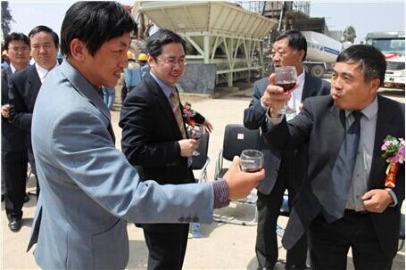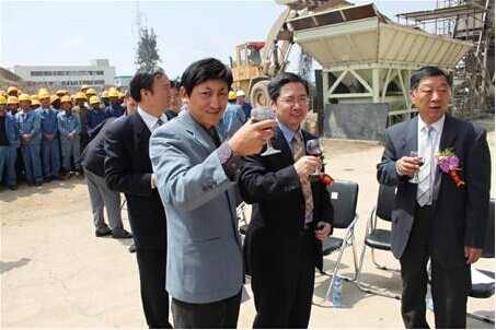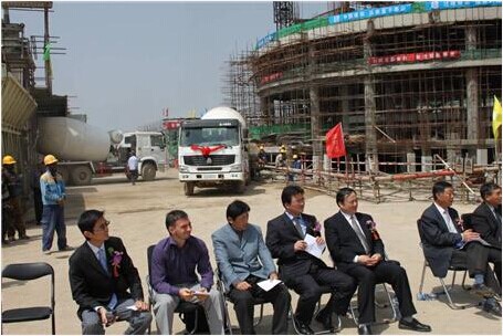 當?shù)谝环交炷凉嘧⒃跇求w當中,鞭炮齊鳴、彩帶飄舞,施工現(xiàn)場所有