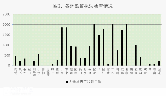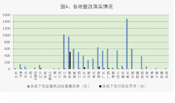 各地共下發(fā)監(jiān)督執(zhí)法檢查整改單9589份、行政處罰書892份,處罰相關(guān)單位330個(gè),處罰相關(guān)人員135名,實(shí)施信用懲戒250起,曝光違法違規(guī)典型案例142起。從行政處罰起數(shù)看,安徽、湖南、山東3個(gè)省處罰力度較大;從曝光典型案例起數(shù)看,云南、重慶、海南3個(gè)省、直轄市曝光力度較大。