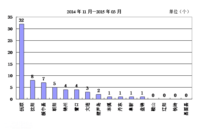 1.從查處違法工程的數(shù)量看,撫順、沈陽、營口力度較大,5個月來平均每月分別查處9、5、3個以上違法工程;盤錦、大連數(shù)量較少,平均每月查處違法工程不足1個。
