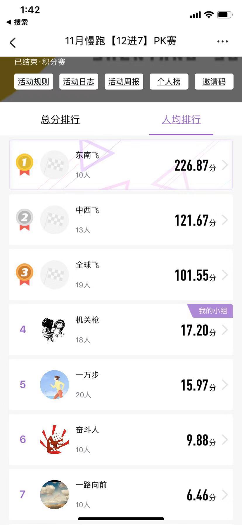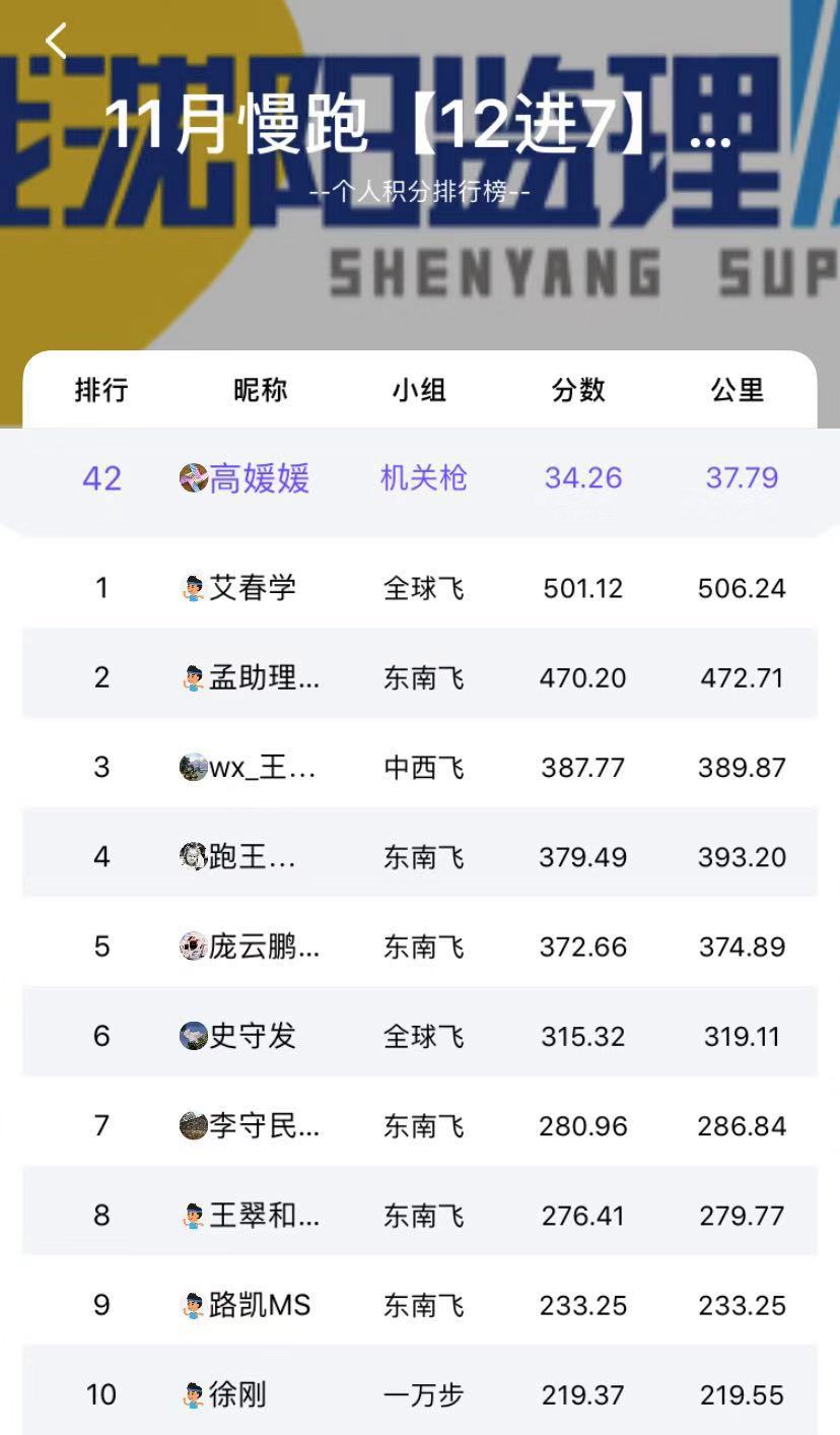 我們7只實力跑團為:東南飛、中西飛、全球飛、機關槍、一萬步、奮斗人、一路向前;根據(jù)人均跑量排行“東南飛”獲得了11月慢跑團隊獎勵,