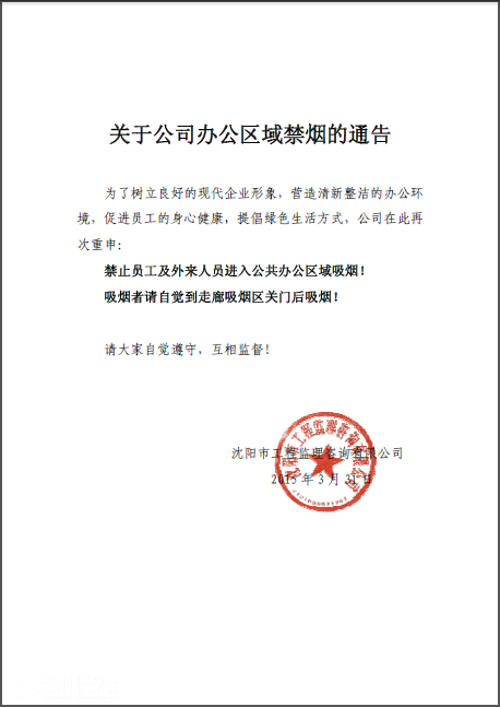 關(guān)于公司辦公區(qū)域禁煙的通告(1)
