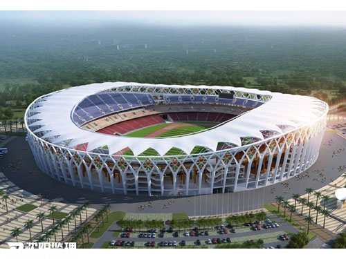 建設(shè)一座6萬座體育場,總用地面積為20公頃;總建筑面積61250m2,采用鋼筋混凝土結(jié)構(gòu)和PTFE膜材罩棚,罩棚使用鋼結(jié)構(gòu)桁架支撐,總體高度為51.4米。主要建設(shè)內(nèi)容包括:(1)運動場地:一個國際標(biāo)準(zhǔn)的田徑足球比賽場(含8條塑膠跑道及天然草皮足球場)和專用設(shè)施(LED電子顯示大屏兩塊,場地照明,音響系統(tǒng)及必要的體育器材)。(2)看臺及功能用房:看臺布置約6萬個座位,包括普通觀眾席、VIP席、媒體席、運動員席、殘疾人席??磁_上部部分設(shè)置罩棚,看臺下部布置功能用房。功能用房主要包括:運動員及賽事管理區(qū),貴賓區(qū),新聞媒體區(qū),場館管理及技術(shù)區(qū),普通觀眾區(qū)等。(3)用地紅線內(nèi)機動車停車數(shù)量1400輛。