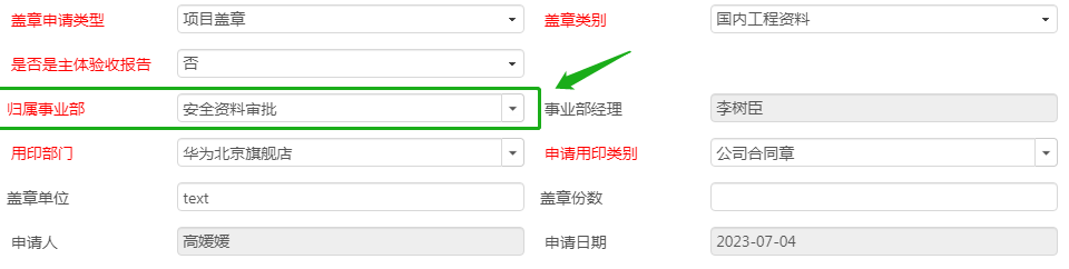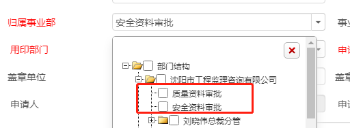 項目資料蓋章,歸屬事業(yè)部位置安全類資料選擇 “安全資料審批”(審批人為:李樹臣)如圖3所示,質(zhì)量類資料選擇“質(zhì)量資料審批”(審批人為:那明暤)如圖4所示
