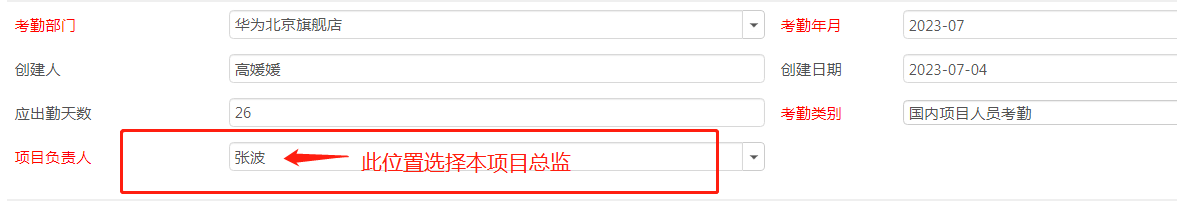 月度考勤申請中,選擇考勤類別[國內(nèi)項目人員考勤]后,項目負(fù)責(zé)人位置選擇[所在項目總監(jiān)],如圖1所示。